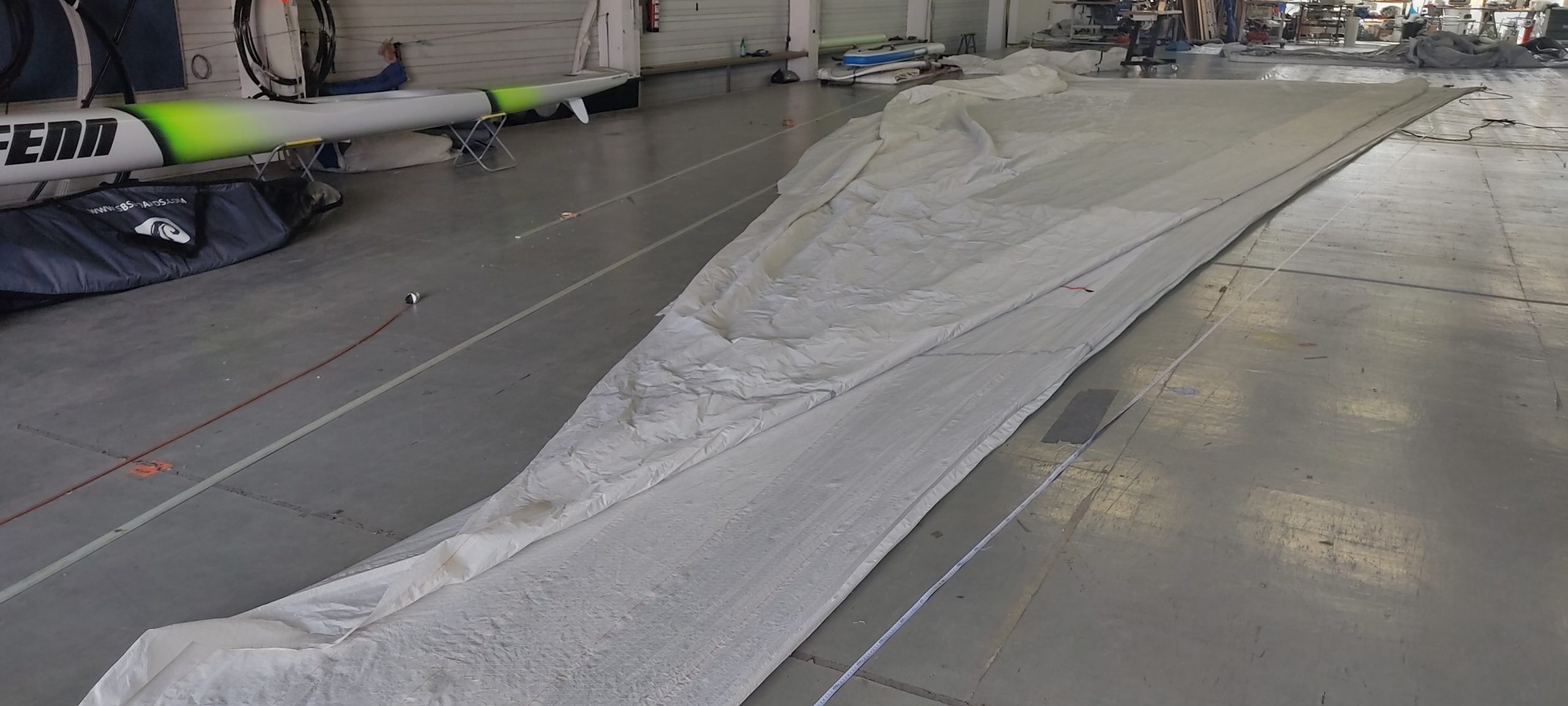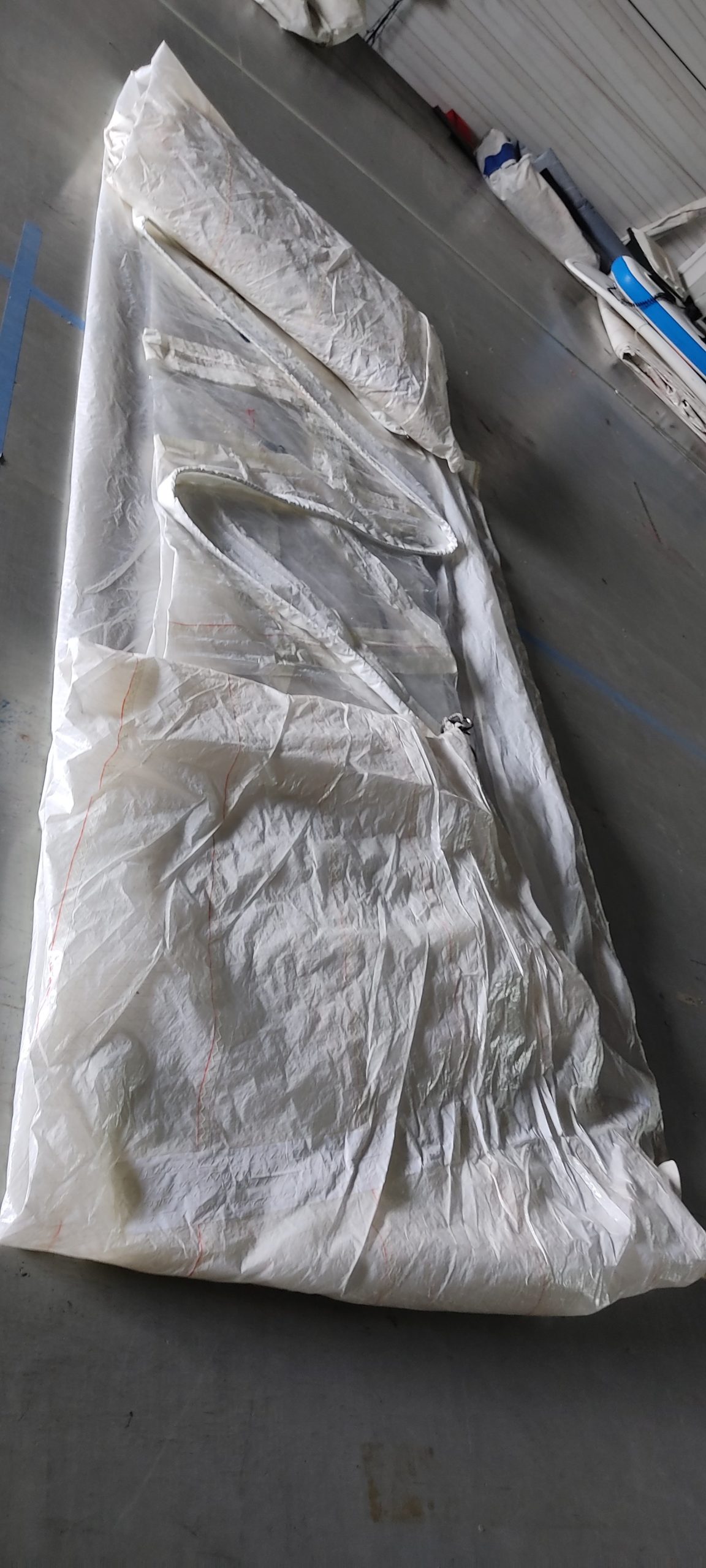 I was lucky enough to stumble across an old spinnaker staysail tucked in the back corner of a sail container at the yard here. It was originally built by North Sails for the Swedish Victory Challenge campaign in 2007.