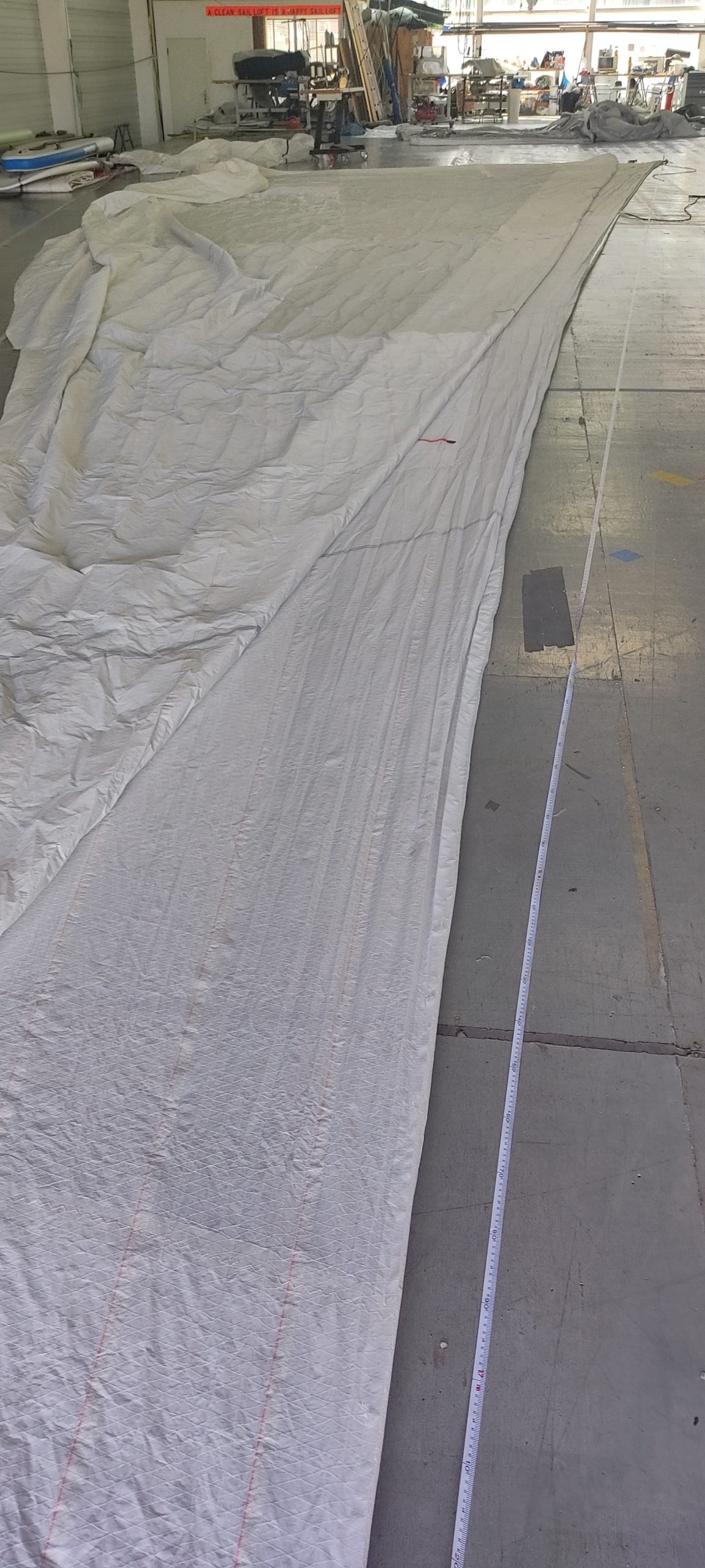 With the sail cut into two pieces ( a top and bottom) it was simply a matter of joining the two pieces back together at the new length. We spent a bit of time overlapping the top piece with the bottom piece to get the shape we wanted before we cut the excess fabric off. The foot length was already perfect so we left that part untouched.