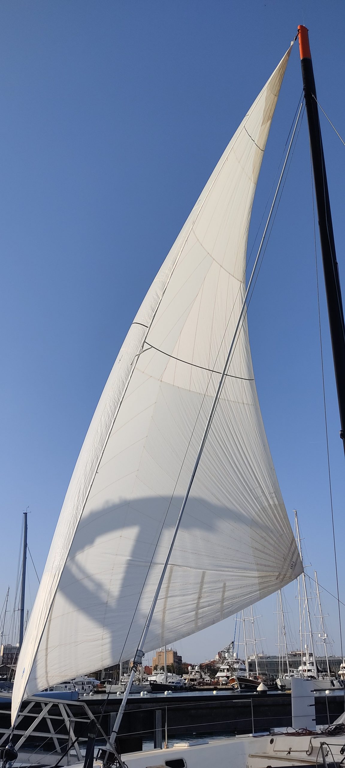 The first part of the process was to measure the distance from the bow pole to the mast head halyard. As we have modified the boat quite dramatically by adding a new front beam with longeron and bow pole so all our existing measurements were no longer correct. We also wanted to be able to sheet the sail at the back of the boat. The description of a Code 0 being an overlapping headsail refers to the clew of the sail overlapping the mainsail and sheeting aft of the mast. We wanted to sheet as far aft as we could so we needed to know our foot length measurement as well.