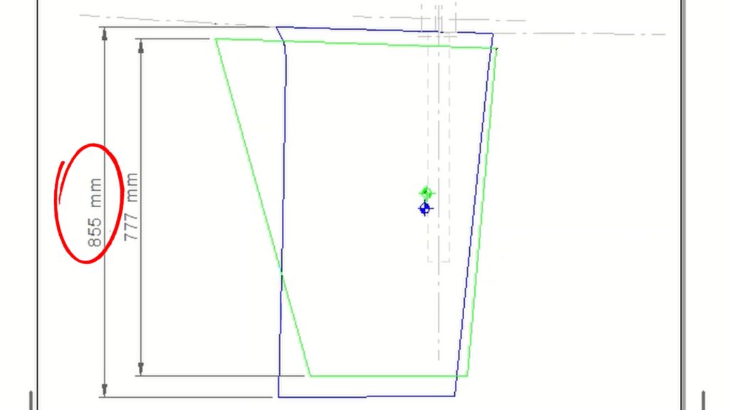 The old rudder is shown here in green, while the new rudder is shown in blue. You can see the new rudder is 855mm in total length, it is 35mm bigger at the top and 50mm bigger at the bottom. While the new blue rudder is not greatly bigger than the previous rudders, it is a higher aspect ratio. The higher the aspect ratio, the more lift is generated.